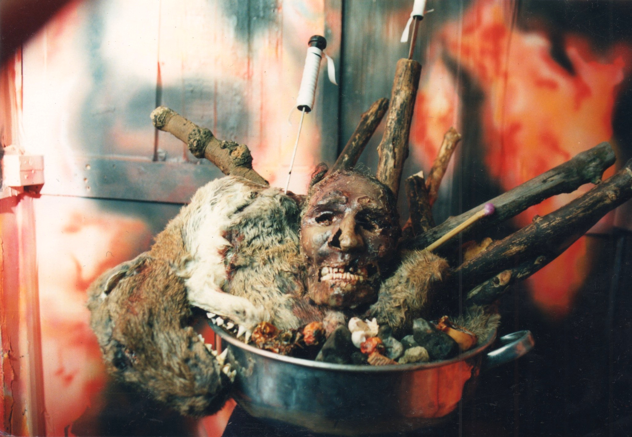Visitors would enter the shack through a light-proof doorway at the rear of the structure. Every five seconds the nganga would be illuminated by the flash of a strobe light, it’s position slightly altered each time. The construction of the nganga formed the basis for Mumbo Jumbo an experimental video based on the story of the Mexican Narcosatánicos cult who used an nganga in their rituals.