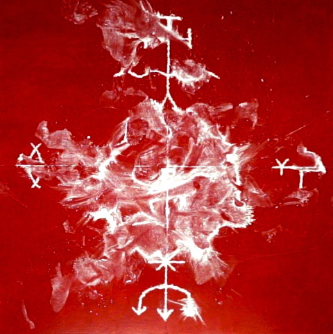 A ponto is an occult diagram used in the Afro-Brazilian Palo, Quimbanda and Umbanda religious traditions that shares qualities with vèvès in Haitian Vodou. The drawing of Banbha’s ponto on the gallery floor was made in talcum powder which is used by Northern Soul dancers to make the dance floor slippery smooth.